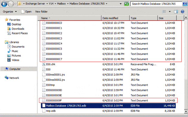 Once the restore process is done, taking a look at the original location of the database will reveal that the .edb file is back in place, and all the log files generated between the backup and the crash are still there.