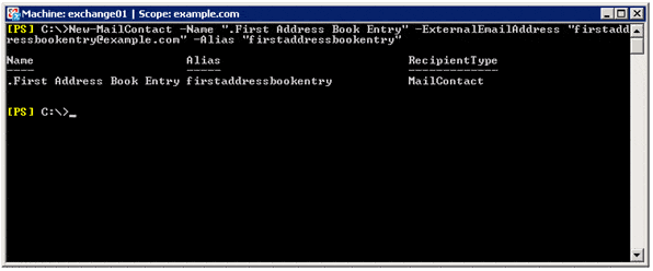 New-MailContact -Name ".First Address Book Entry" -ExternalEmailAddress "firstaddressbookentry@example.com" -Alias "firstaddressbookentry" |