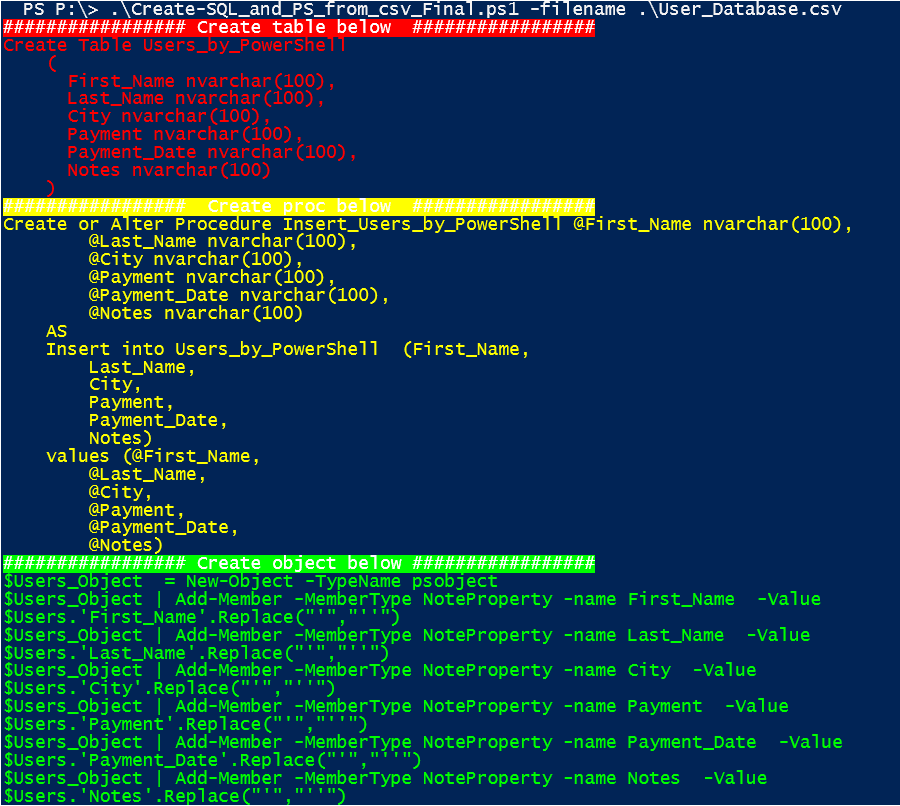 $object = "Users" $filename = "User_Database.csv" $first_line = get-content P:\$filename -First 1 $fields = $first_line.split(",").Replace('"','') function create-Sql_table($object, $fields) { $table = "Create Table $object`_by_PowerShell ( " foreach ($field in $fields) { $table += " $field nvarchar(100) " } $table += ")" return $table } function create-Sql_Insert_Procedure($object, $fields) { $procedure = "Create or Alter Procedure Insert_$object " foreach ($field in $fields) { $procedure += "@$field nvarchar(100)`, " } $procedure = $procedure.TrimEnd(", ") $procedure += " AS Insert into $object (" foreach ($field in $fields) { $procedure += "$field`, " } $procedure = $procedure.TrimEnd(", ") + ") values (" foreach ($field in $fields) { $procedure += "@$field` , " } $procedure = $procedure.TrimEnd(" , ") + ")" return $procedure } $createdTable = create-Sql_table -object $object -fields $fields $createdProcedure = create-Sql_Insert_Procedure -object $object -fields $fields Write-Host $createdTable write-host $createdProcedure |