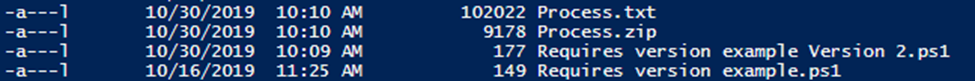 If you run this under Version 5 or greater, it will create the Process.txt file and zip it up. If you run it under an earlier version, such as the –Version 2.0 above, the script will still be able to create the Process.txt file since Get-Process is a cmdlet available in version 2.0. Since Compress-Archive is not, the script will skip that step and give an error message. It’s up to you if you want to write scripts that can detect the version of PowerShell and behave differently depending on the version, but in many cases if you simply want to abort the script, the #Requires comment is by far the easiest way of handling things.