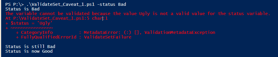 When using ValidateSet, keep in mind that it only is effective if you assign a valid value at the time you declare the variable. Otherwise, any value can be used (as shown by the $status in the above script).