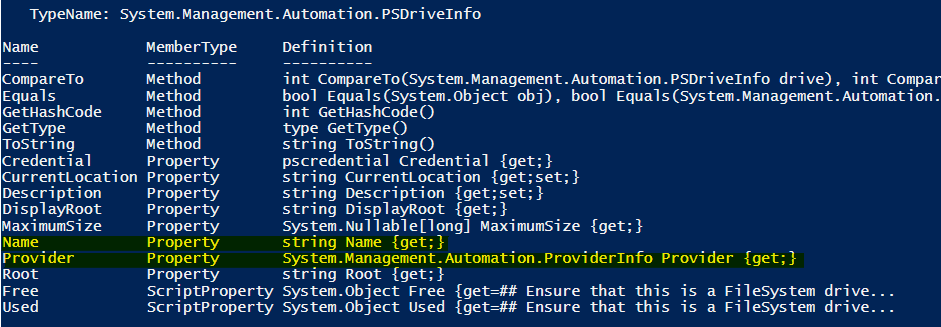 param([parameter(ValueFromPipeLineByPropertyName)] [string] $name, [parameter(ValueFromPipeLineByPropertyName)] [System.Management.Automation.ProviderInfo] $Provider) process { Write-Host "The PSDrive name is: $name and provider is $($Provider.Name)" } |