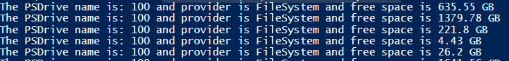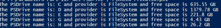 param([parameter(ValueFromPipeLineByPropertyName)] [string] $name, [parameter(ValueFromPipeLineByPropertyName)] [System.Management.Automation.ProviderInfo] $Provider, [parameter(ValueFromPipeLineByPropertyName)] $free, [parameter(ValueFromPipeLineByPropertyName)] [System.Nullable[long]] $MaximumSize) process { if ($free -ne $null) { Write-Host "The PSDrive name is: $name and provider is $($Provider.Name) and free space is $([math]::round($($free/1GB),2)) GB out of $MaximumSize" } else { Write-Host "The PSDrive name is: $name and provider is $($Provider.Name)" } } |