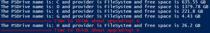 param([parameter(ValueFromPipeLineByPropertyName)] [string] $name, [parameter(ValueFromPipeLineByPropertyName)] [System.Management.Automation.ProviderInfo] $Provider, [parameter(ValueFromPipeLineByPropertyName)] $free, $buymore) process { if ($free -ne $null) { Write-Host "The PSDrive name is: $name and provider is $($Provider.Name) and free space is $([math]::round($($free/1GB),2)) GB" if ($([math]::round($($free/1GB),2)) -lt $buymore) { write-host "==================> Time to think about upgrading! $name" -ForegroundColor Red } } } |