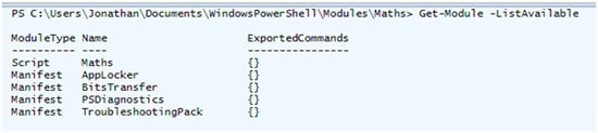 The cmdlet Get-Module with the -ListAvailable parameter confirms that the Maths module is potentially available to use.